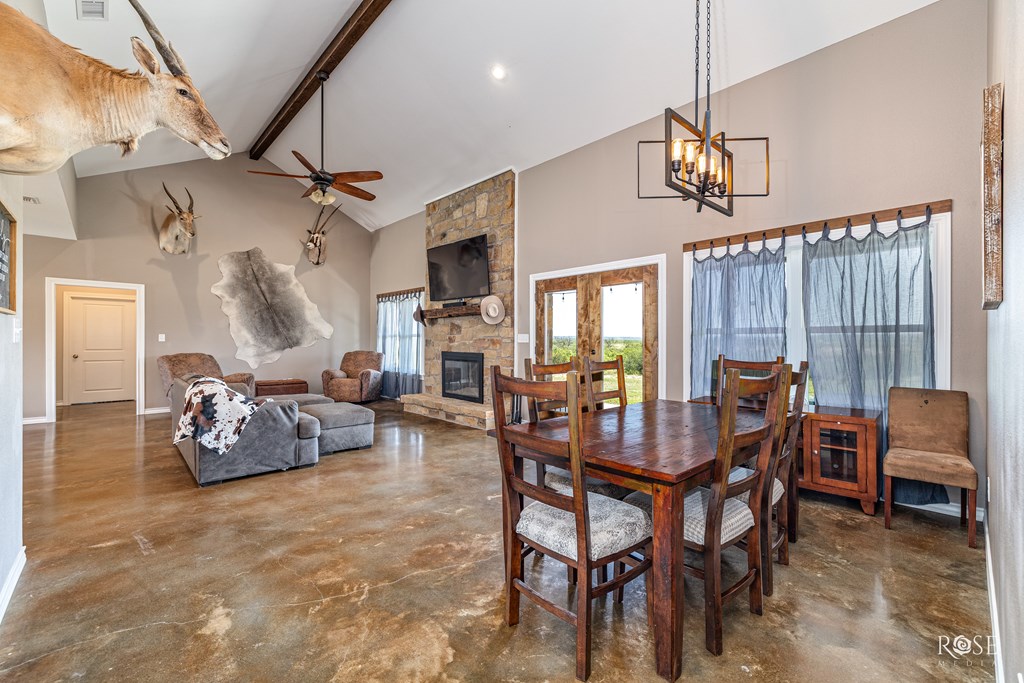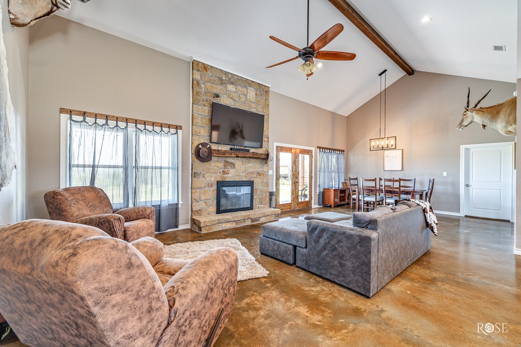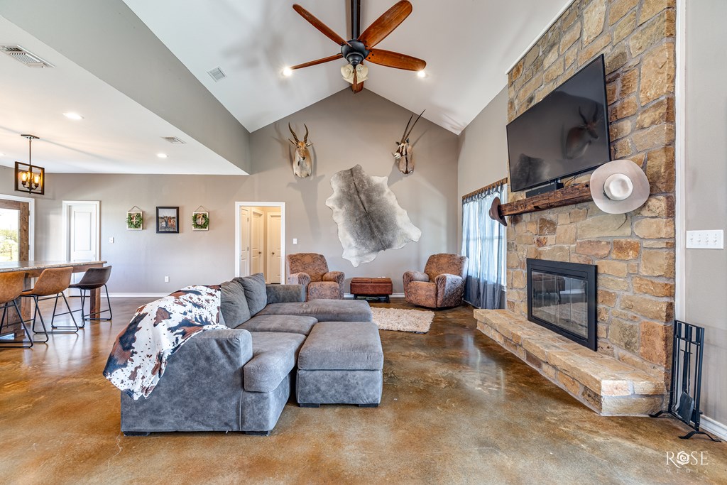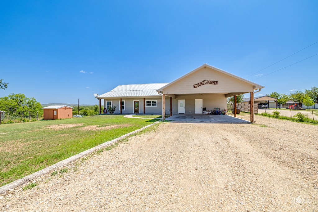 RARE RIVERFRONT RETREAT ON 5 ACRES!! Don't miss this stunning 3 bed, 2 bath home nestled on 5 peaceful acres with river frontage, abundant wildlife and views that will take your breath away. Located near the end of a quiet road with friendly neighbors and minimal traffic. This property offers the perfect blend of privacy and connection to nature. Inside, you will find a vaulted living room with a striking fireplace, an oversized kitchen with a 9 ft island (storage on both sides!) and generously sized bedrooms. The concrete master closet doubles as a storm shelter and the entire home is designed with handicap accessibility in mind: 3 ft doors, no thresholds and a walk in shower. Step outside to a 10 ft back porch overlooking the valley and river. A perfect front-row seat to watch storms roll in or enjoy peaceful sunsets. Bonus features include a 2-sided barn and a separate studio space. This one-of-kind property is more than a home--it's a LIFESTYLE! Schedule your showing today!