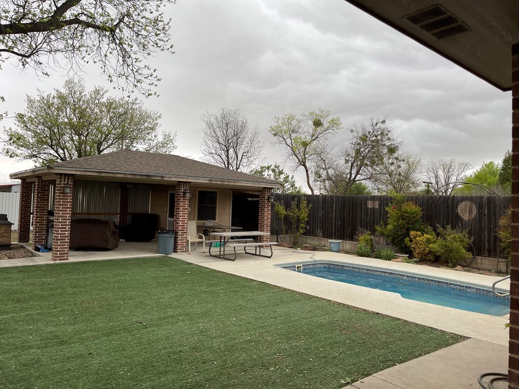 Cozy oasis right here in Sterling City. Enjoy a half acre with your own in ground pool, and porches to relax in the shade. The pool has its own 1/2 bath and entertainment area. The house has 2 bedrooms and 1 & 1/2 baths. Extra large closets, granite throughout, and extra parking including an extra carport with extra room for storage or an extra bedroom. There is no shortage of room or storage in this house. Come take a look and make it yours! *Seller is a Licensed Realtor in Texas.
