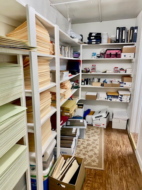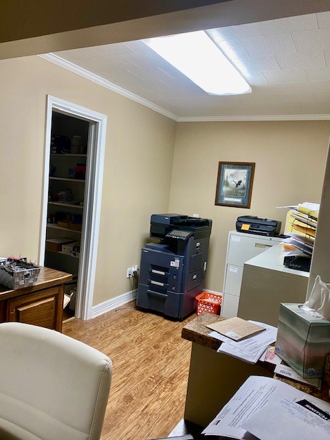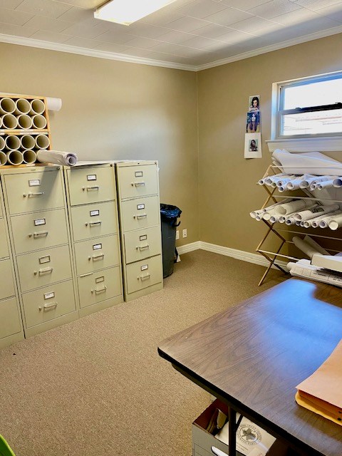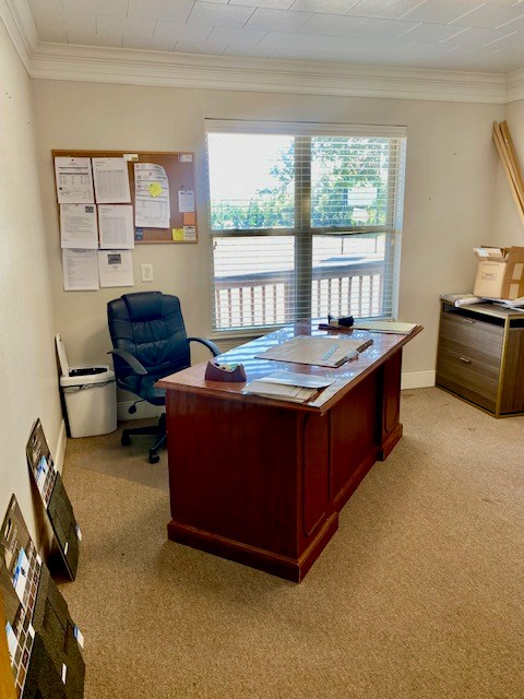 Great potential with this high visibility/high traffic intersection. This office has a waiting area, a receptionist area and 6 divided office spaces. There are 2 half baths, multiple storage areas, a large file room and 2 kitchenette areas. There are 10 parking spaces, 5 of which are covered.
