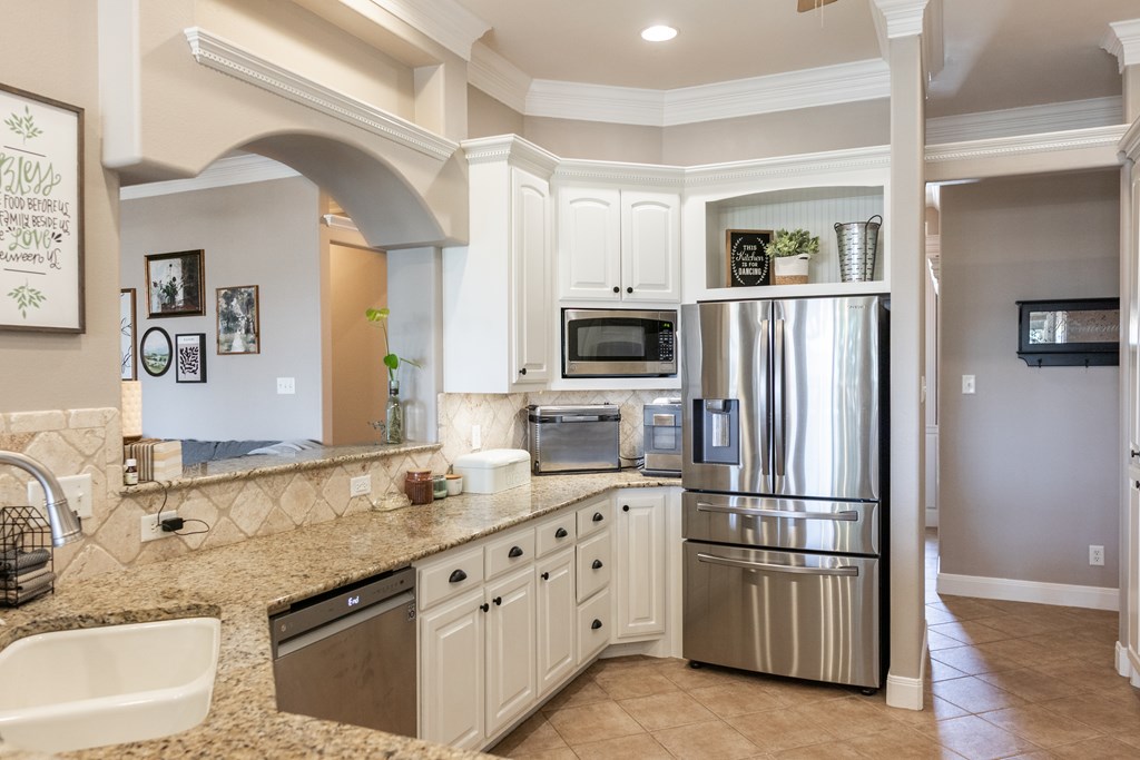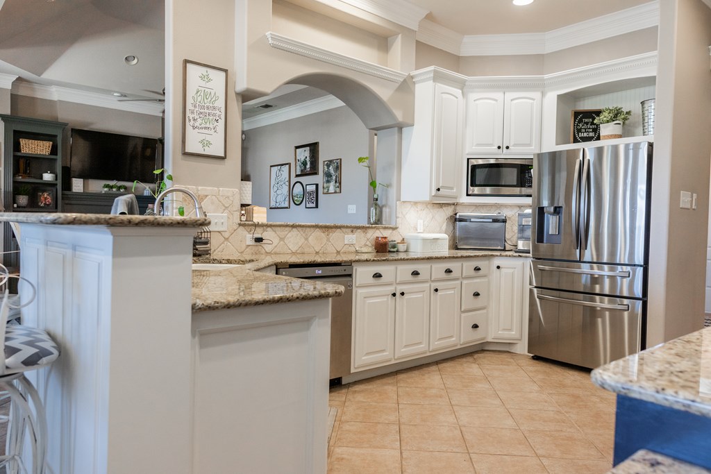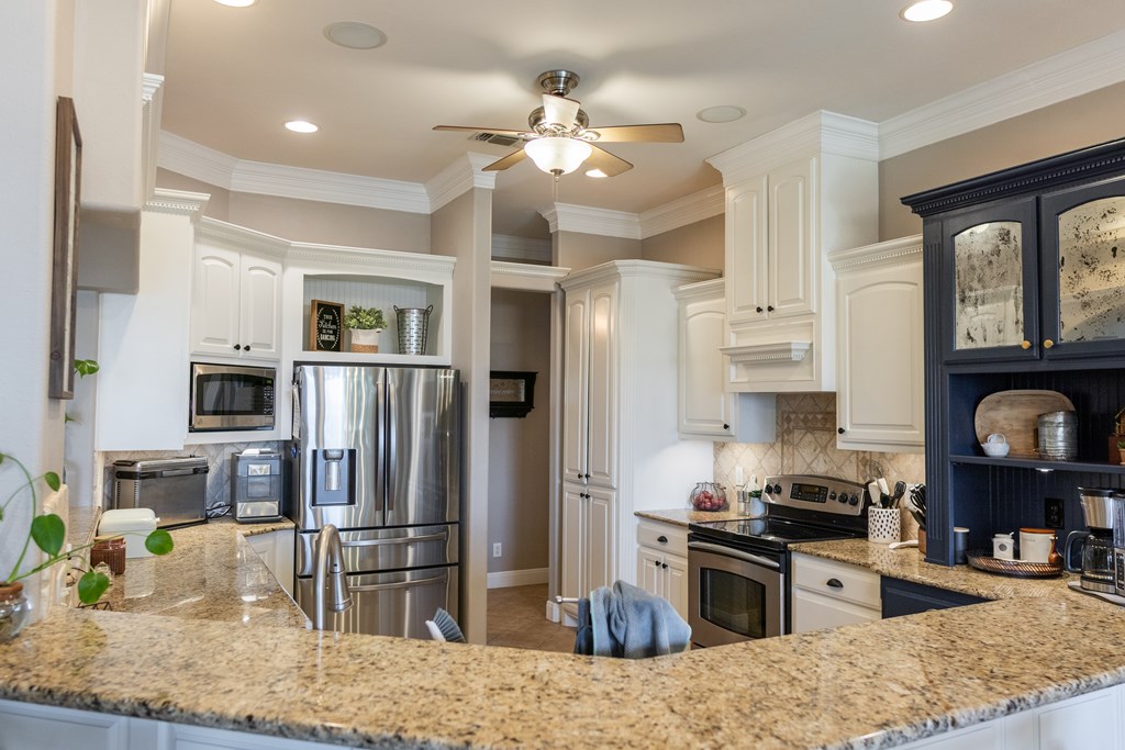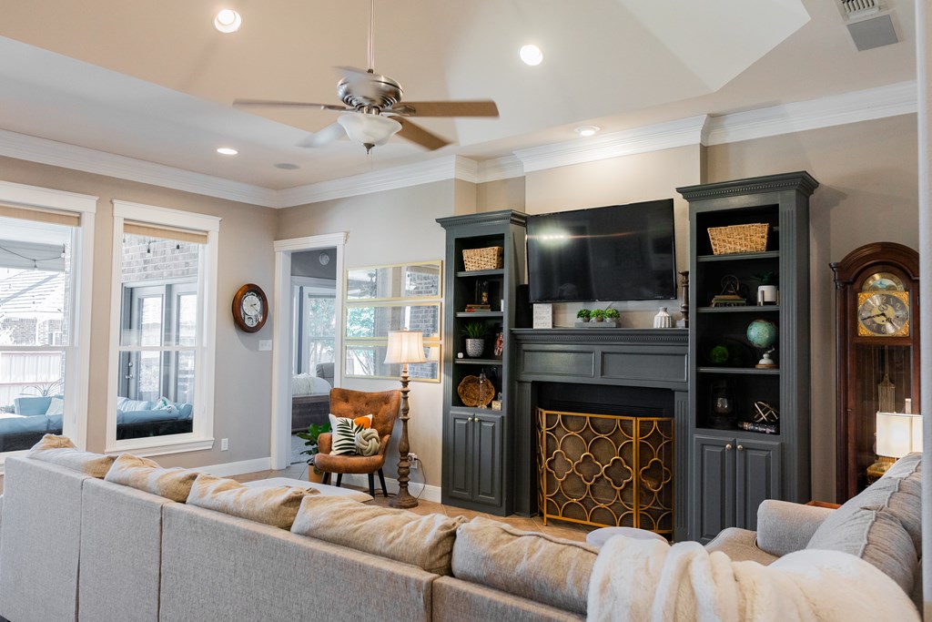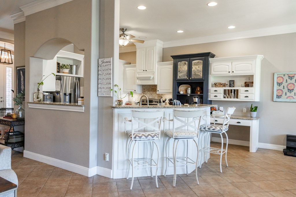 This charming home with stone accents in the desirable Bentwood County Club neighborhood. A covered front porch invites visitors into a spacious living room that features built-in bookshelves and a gas fireplace, with large windows connecting to the kitchen and dining area. The chef's kitchen boasts elegant custom cabinetry and a generous bar top for entertaining. A standout feature is the expansive master suite, complete with a wall of windows, private patio access, built-ins, and a luxurious bathroom. A second master suite also offers patio access and a spacious bathroom for guests. The versatile second den or office is complemented by a nearby half bathroom. Two additional bedrooms at the front include built-in desks and share a Jack & Jill bathroom. Additional features include a large laundry room, mudroom lockers, & a covered back patio, along with an audio system, plantation shutters, & a three-car garage. This home combines comfort and elegance in a well-established community.